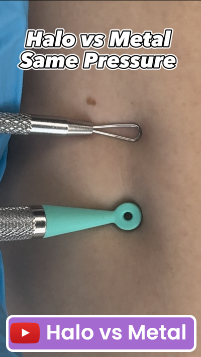 I’ve been an esthetician since 2021. I had some blackheads on the bottom of my lip line — a very sensitive, tender area when extracting. When using the Halo®, the pain was maybe a 3/10. What really surprised me was that there was little to no redness or indent from the tool. I really enjoyed this tool and will be using this on my clients as well!